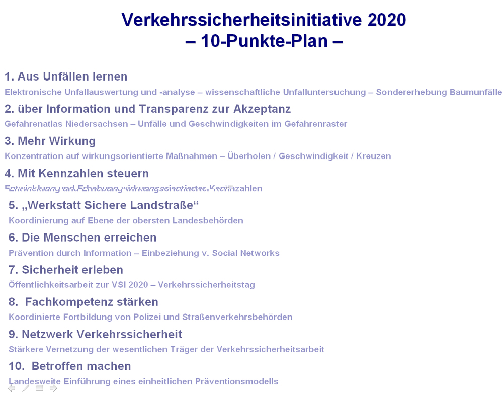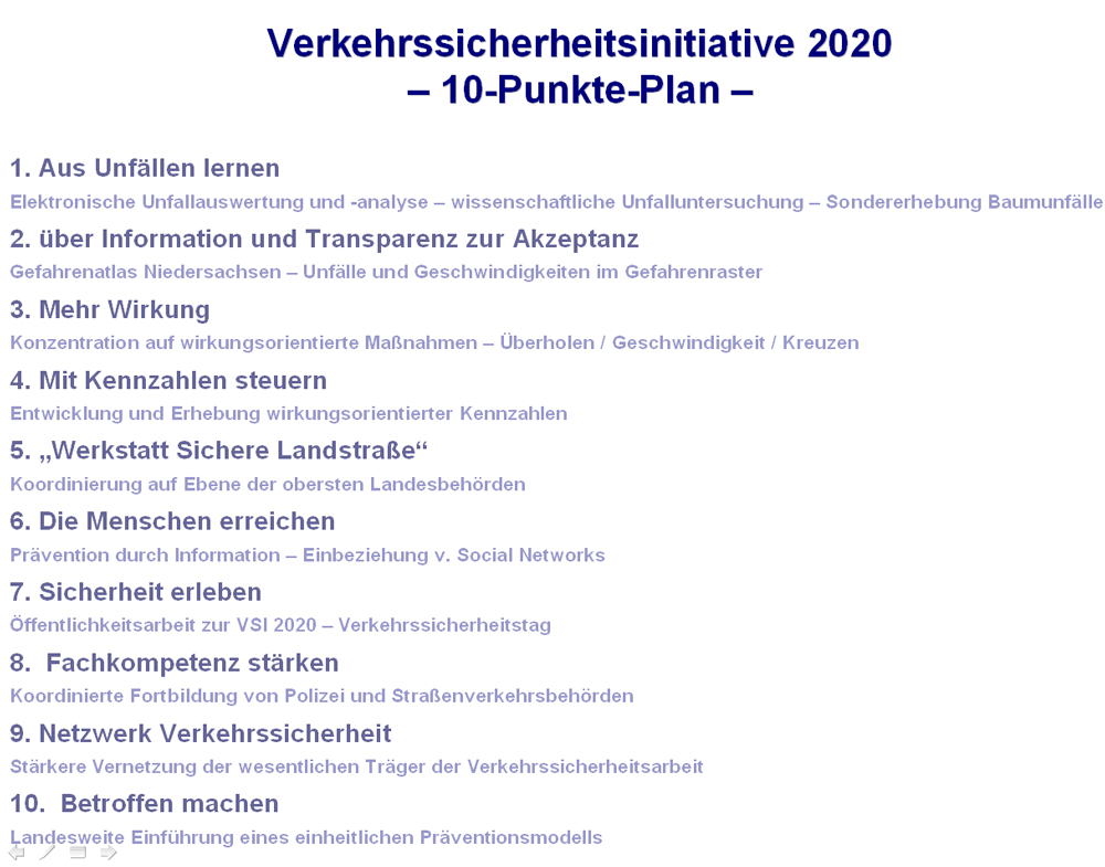 Vor diesem Hintergrund hatte der niedersächsische Innenminister Uwe Schünemann bereits im Frühjahr 2011 die Verkehrssicherheitsinitiative (VSI) 2020 ins Leben gerufen, deren Ziel es ist, die Zahl der auf Niedersachsens Straßen getöteten und schwerverletzten Personen bis zum Jahr 2020 um ein Drittel zu reduzieren.