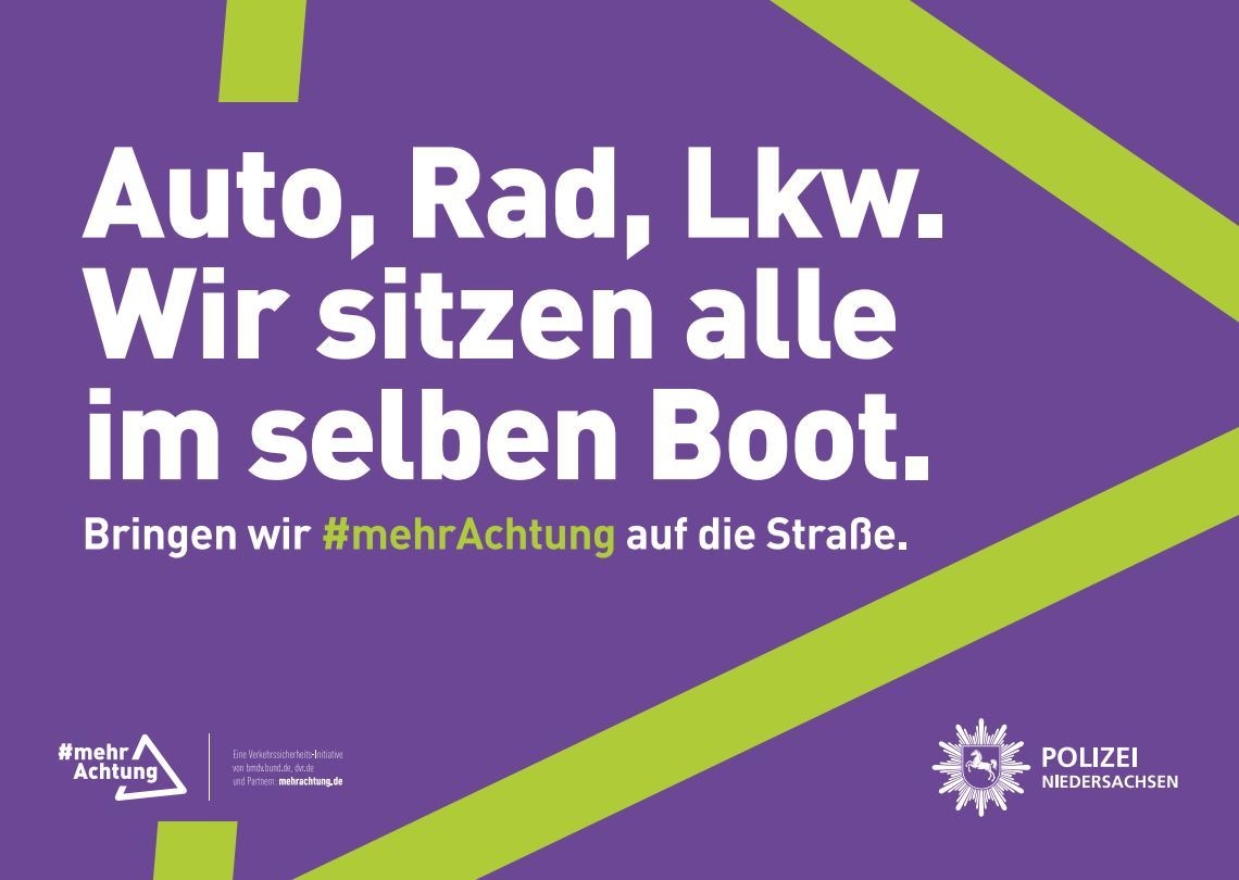 Den diesjährigen Schwerpunkt der Verkehrssicherheitsarbeit der Polizei Niedersachsen bildet das Thema „Rücksicht im Straßenverkehr“. Unser Ziel ist ein gemeinsames und rücksichtsvolles Miteinander auch und gerade im Straßenverkehr. Jeder kann hierzu beitragen. Vom Schulkind bis ins hohe Alter, vom zu Fuß Gehenden bis zum LKW-Fahrenden. Alle nehmen gemeinsam am Straßenverkehr teil und können mit rücksichtsvollem und achtsamen Verhalten einen Beitrag zu #mehrverkehrssicherheit leisten.