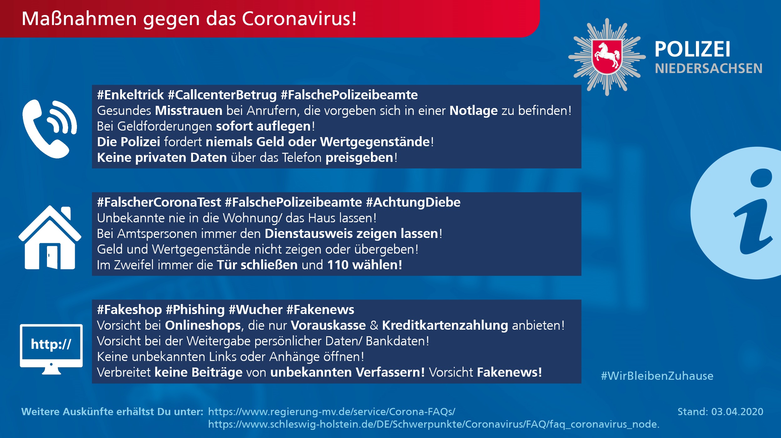 Neben Fakeshops, die u.a. Atemschutzmasken und Desinfektionsmittel anbieten, werden auch diverse Spam- und Phishingmails versandt. Falsche Polizisten oder falsche Mitarbeiter des Gesundheitsamtes versuchen mit dem Vorwand eines Corona-Schnelltests in ihr Haus/ihre Wohnung zu kommen. Auch mit dem Enkeltrick versuchen die Täter über das Telefon ihre Opfer um hohe Geldsummen zu bringen.